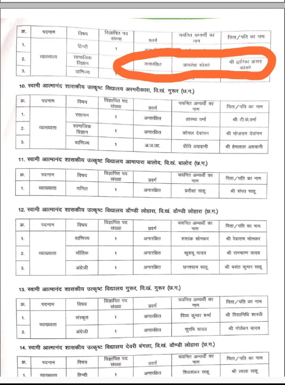 भर्ती प्रक्रिया में सबसे गंभीर आरोप चयन समिति के नोडल अधिकारी डी.पी. कोसरे पर लगे हैं। बताया जा रहा है कि उन्होंने नियमों की अनदेखी करते हुए अपनी ही पुत्री आकांक्षा कोसरे की नियुक्ति स्वामी आत्मानंद विद्यालय, घोठिया में व्याख्याता (सामाजिक विज्ञान) पद पर करवा ली।