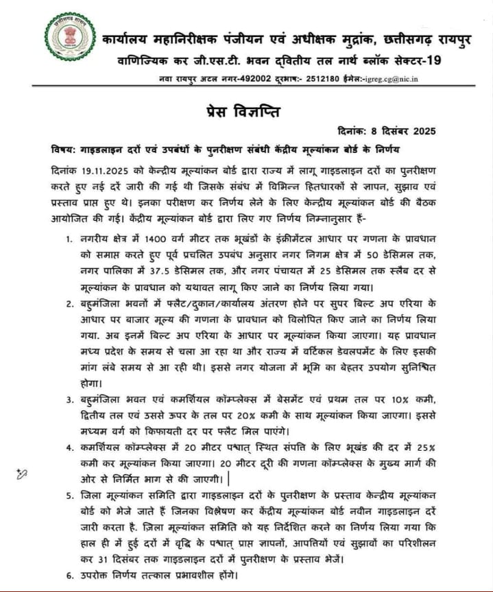 रायपुर। छत्तीसगढ़ सरकार ने जमीन और संपत्ति मूल्य निर्धारण को लेकर अहम फैसला लिया है। राज्य सरकार ने कई विवादास्पद आदेश तुरंत वापस ले लिए हैं, जिससे नगरीय और व्यावसायिक क्षेत्रों में प्रॉपर्टी लेन-देन पर असर पड़ेगा।